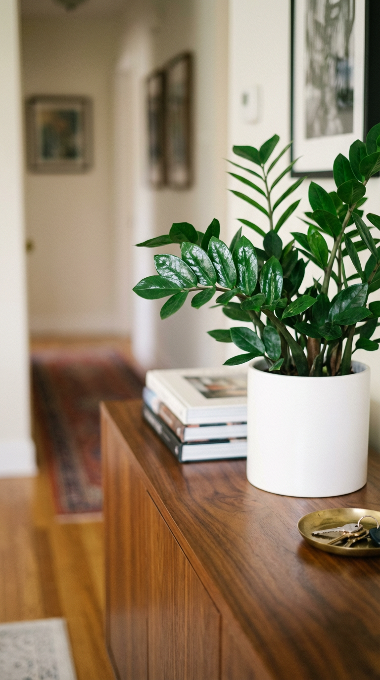 If you’re the kind of person who forgets plants exist until you bump into them, ZZ plant is your soulmate. It has these waxy, almost plastic-looking leaves that reflect light in a way that makes your space feel brighter, even when it’s not. The stems grow in this graceful, arching pattern that looks like you paid a stylist to arrange them.