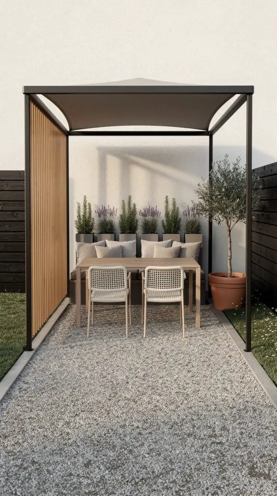 A corner gazebo is a classic small-space move because it uses an area that often goes unused. It creates a visual endpoint, like a period at the end of a sentence, making the garden feel complete.